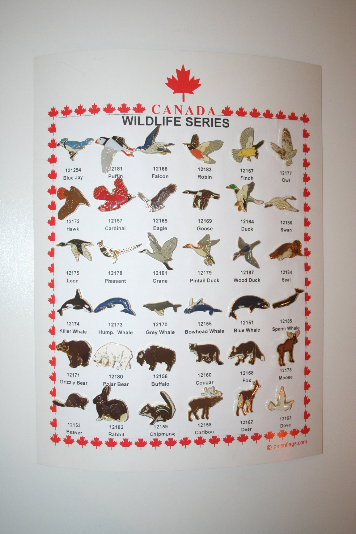 YOU ARE PURCHASING THESE 36 CANADA WILDLIFE SERIES ASSORTMENT PIN LAPEL BADGE SET .. ANIMALS, BIRDS, MAMMALS WHOLESALE... NEW