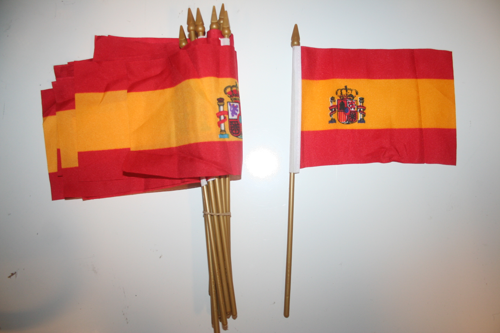 12 SPAIN COUNTRY 4" X 6" SMALL STICK FLAGS ON 10" POLE .. ESPANA .. NEW