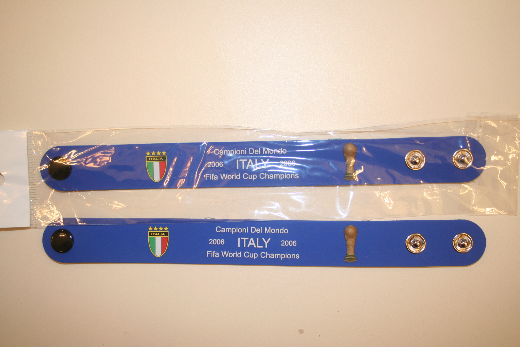 ITS AN ITALY BLUE "FIFA WORLD CUP CHAMPIONS" WRIST BAND...IT HAS "CAMPIONI DEL MONDO" WRITTEN AT THE TOP WITH 2006 ITALY WRITTEN IN THE MIDDLE...AT THE BOTTOM IT HAS "FIFA WORLD CUP CHAMPIONS" WRITTEN...IT HAS THE ITALIAN 4 STAR FLAG ON ONE SIDE AND A PICTURE OF THE FIFA WORLD CUP ON THE OTHER SIDE....THIS WRIST BAND IS EMBOSSED SO THE WORDING AND PICTURES STICK OUT....