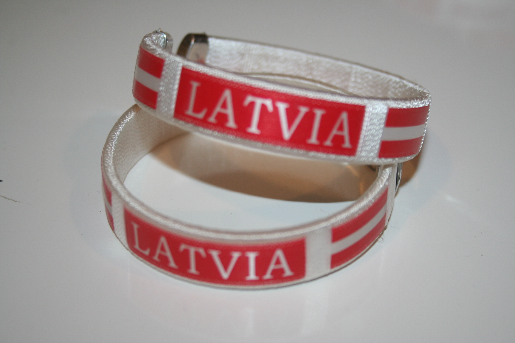 THIS BRACELET MADE OF FLEXIBLE PVC WITH NYLON WOVEN OVER IT. IT HAS LATVIA WRITTEN ON IT WITH THE LATVIA FLAG