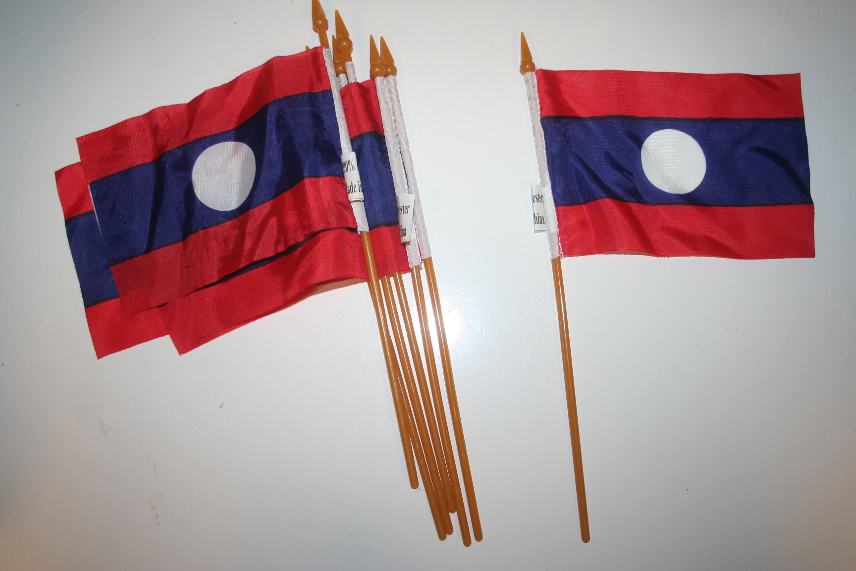 6 LAOS NATIONAL COUNTRY FLAG 4" X 6" SMALL STICK FLAGS ON 10" POLE .. NEW