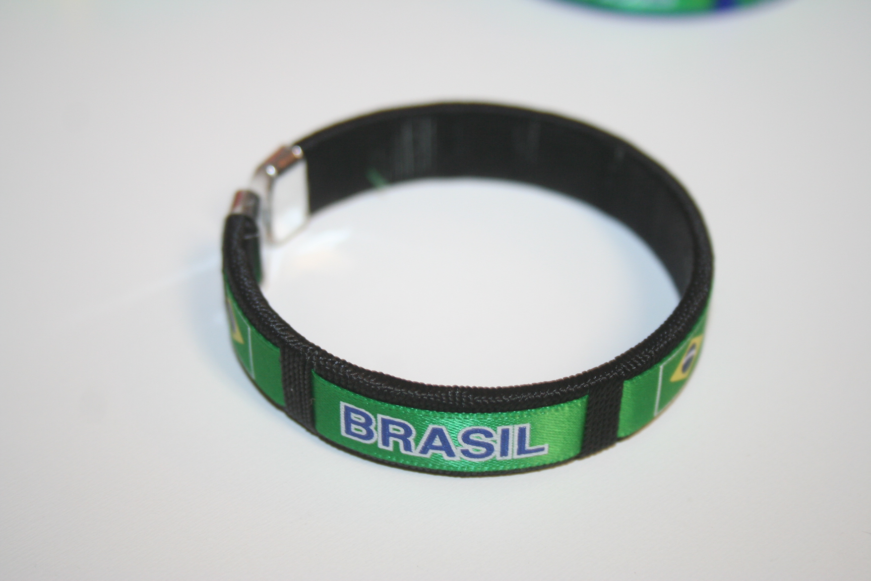 IT HAS BRASIL WRITTEN ON IT WITH THE BRAZIL FLAG ON IT... THE BRACELET IS MADE OF FLEXIBLE DURABLE PVC WITH NYLON WOVEN AROUND IT.