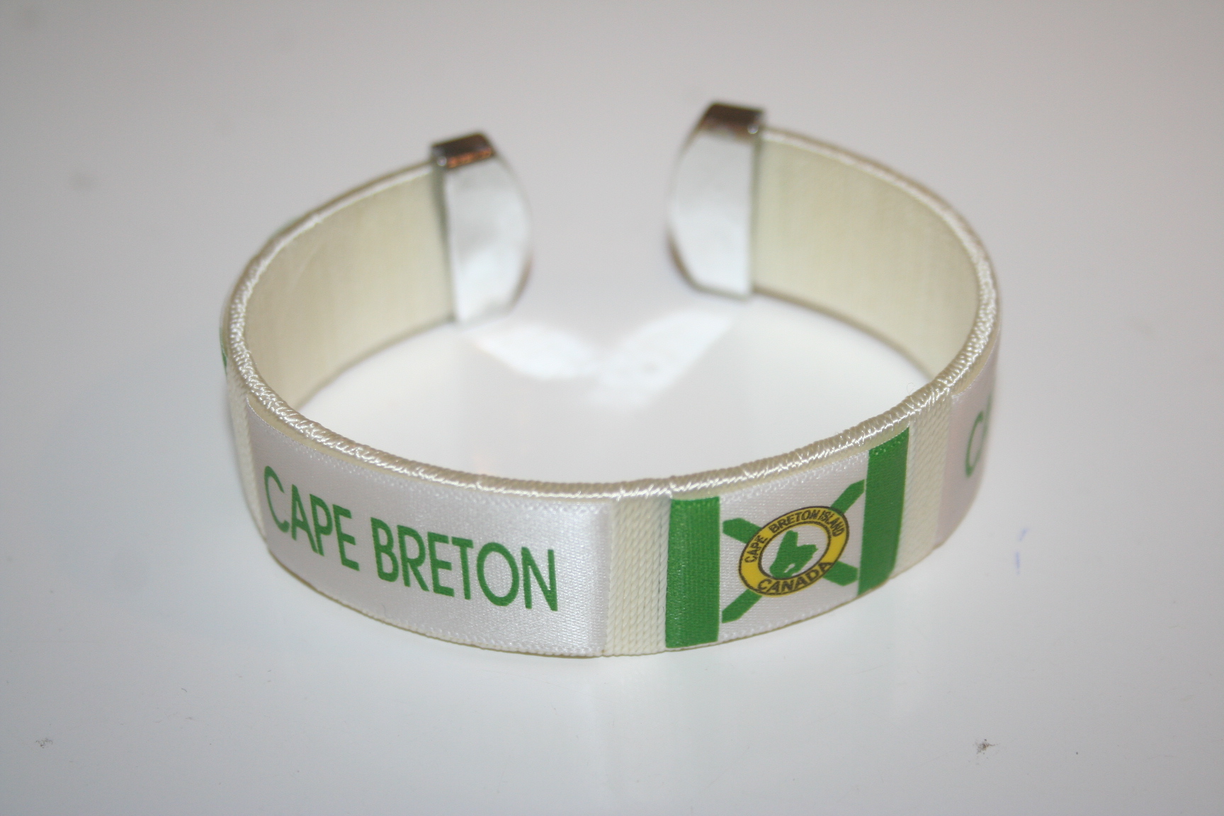 THIS BRACELET IS MADE WITH FLEXIBLE DURABLE PVC WITH NYLON WOVEN OVER IT...IT HAS CAPE BRETON WRITTEN ON IT WITH THE CAPE BRETON FLAG ...