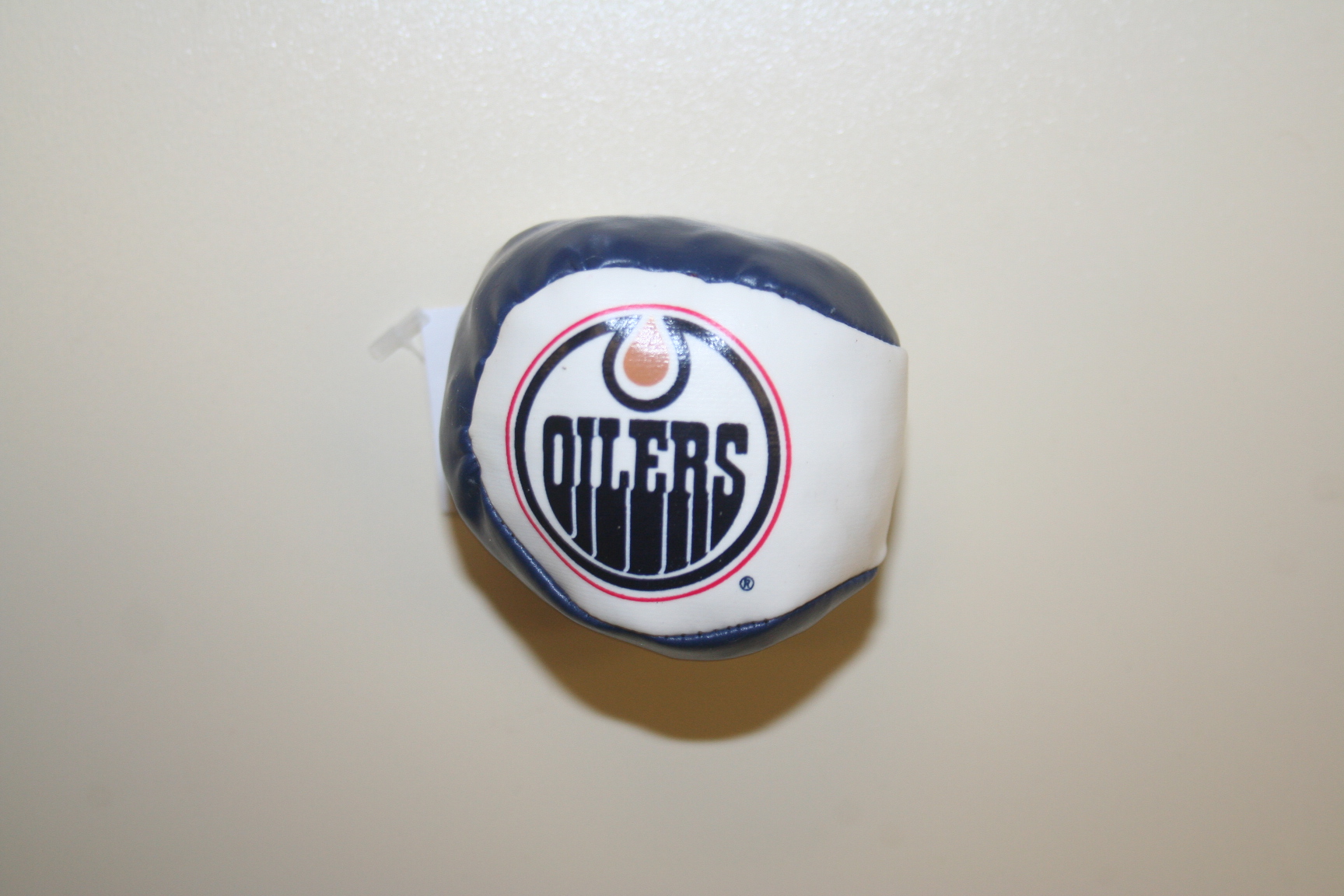 YOU GET THIS FUN HACKEY SACK BALL WITH THE EDMONTON OILER WRITTON ON ONE SIDE AND THE OILERS LOGO ON THE OTHER