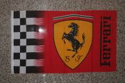 THIS IS A RED FERRARI F1 RACING FLAG. IT HAS FERRARI WRITTEN ON THE SIDE WITH THE FERRARI LOGO. IT ALSO HAS THE RACING FLAG ON THE SIDE.