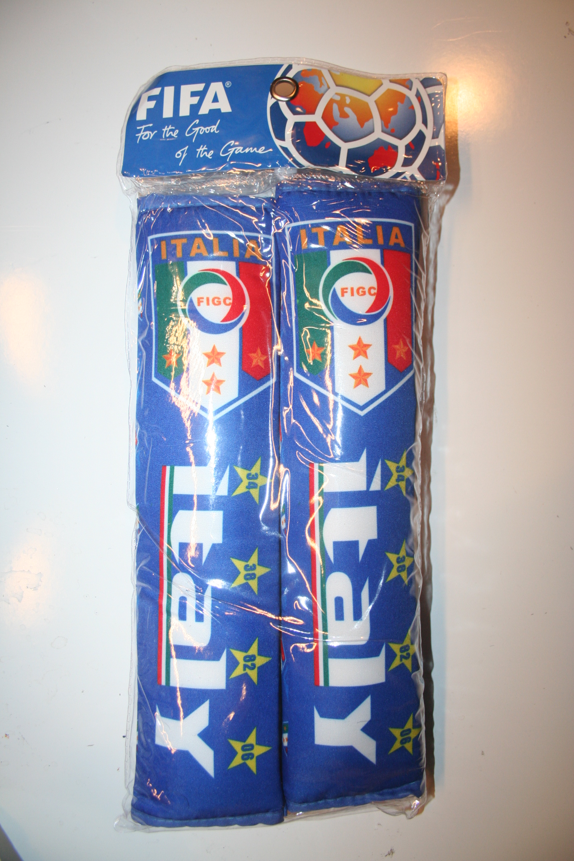 YOU ARE PURCHASING THIS SET OF 2 ITALY FIFA WORLD CUP FOOTBALL SOCCER CAR AUTOMOBILE SEAT BELT COVERS PROTECTORS ... YOU GET 2 PROTECTORS. THESE HAVE VELCRO ON THEM AND GO AROUND YOUR SEAT BELT FOR COMFORT OR FOR DECORATIVE PURPOSES.