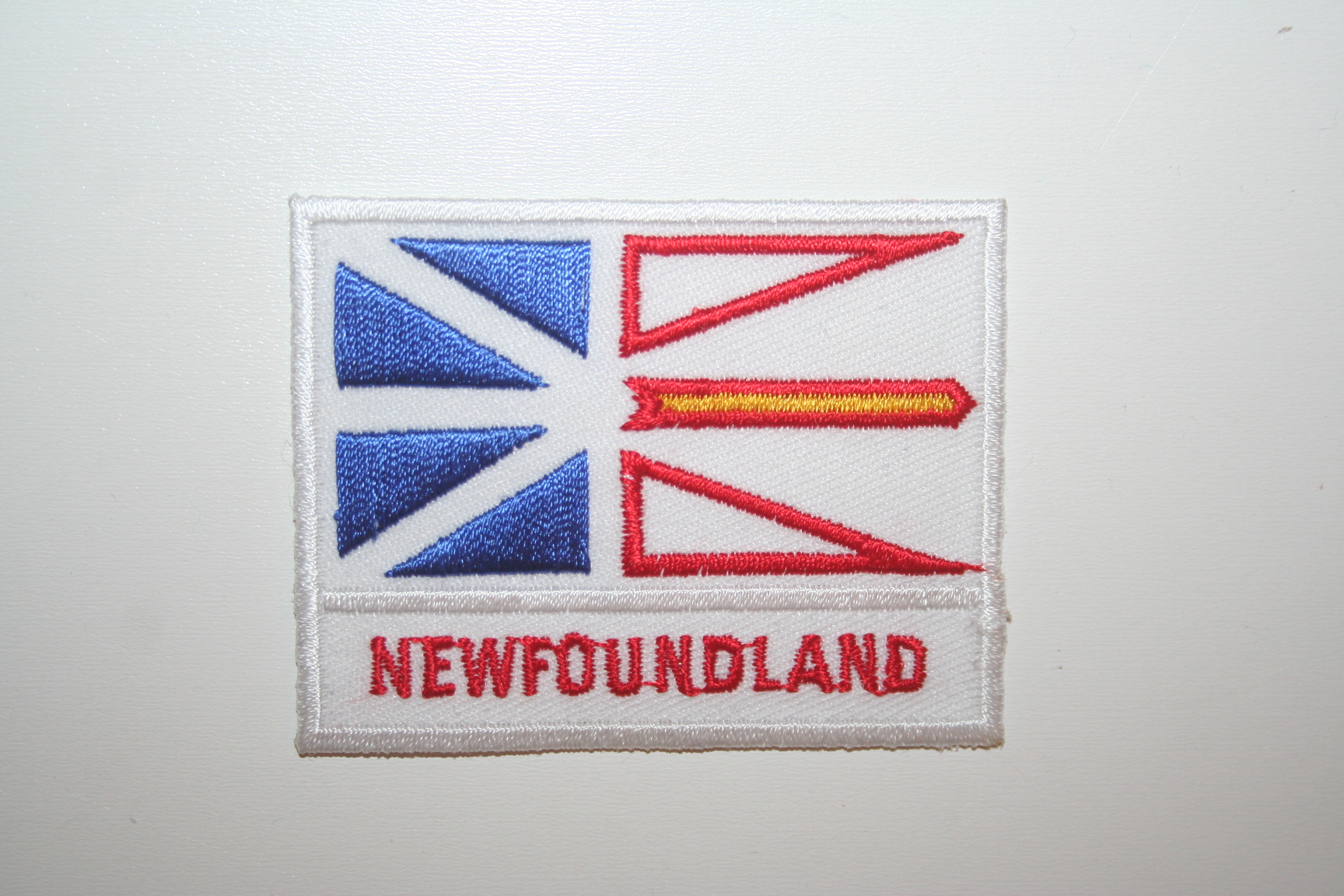 YOU ARE PURCHASING THIS NEWFOUNDLAND CANADIAN PROVINCIAL FLAG SMALL IRON-ON EMBROIDERED PATCH CREST BADGE WITH NEWFOUNDLAND WRITTEN UNDER IT ... IT IS VERY EASY TO IRON ON ANY ARTICLE OR YOU CAN SEW IT ON ...