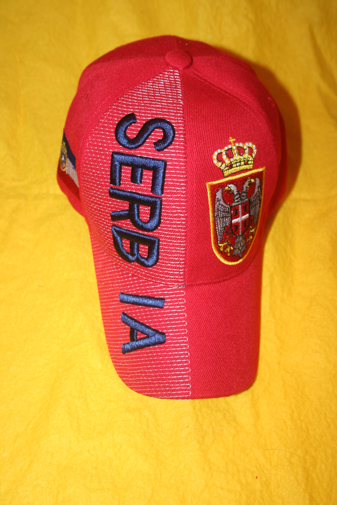 THIS HAT HAS THE SERBIA COUNTRY FLAG LOGO ON THE FRONT OF THE HAT WITH THE WORDING SERBIA WRITTEN DOWN THE SIDE OF THE HAT. IT ALSO HAS THE SERBIA COUNTRY FLAG EMBROIDERED ON THE SIDE OF THE HAT WITH THE WORDING SERBIA WRITTEN ACROSS THE VELCRO STRAP AT THE BACK.