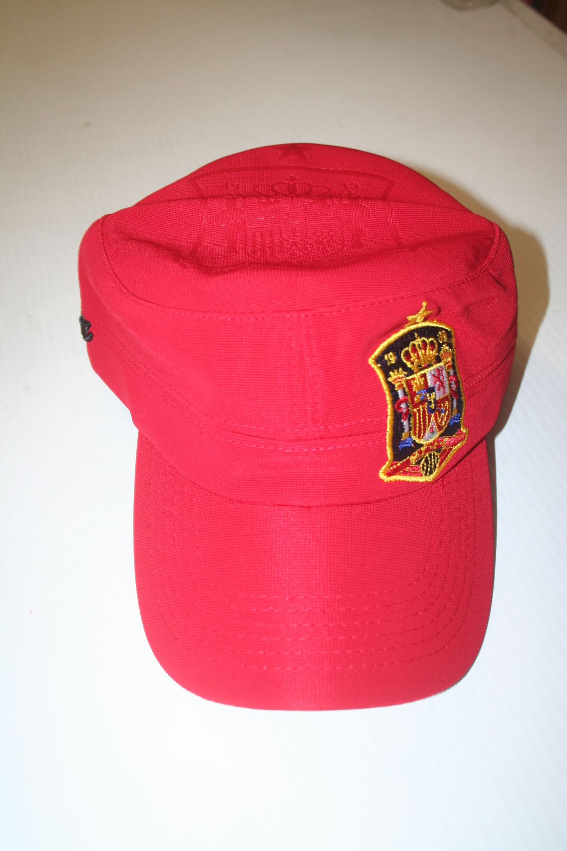 THIS HAT HAS THE SPANISH FLAG CREST ON THE RIGHT HAND SIDE OF THE HAT. IT ALSO HAS THE WORDING ESPANA WRITTEN ACROSS THE LEFT SIDE OF THE HAT. ALSO THE HAT IS FORM FITTED (ONE SIZE FITS ALL).